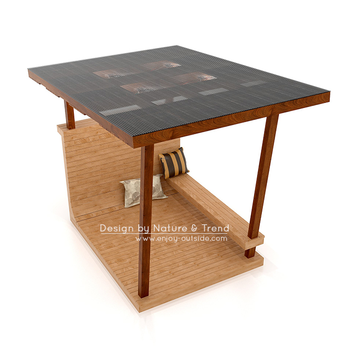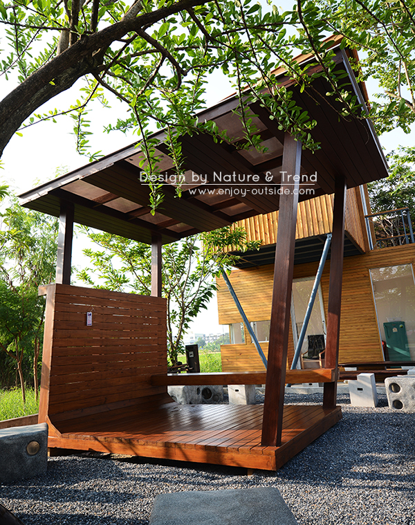 "Yeh" ทำมาจากไม้จริง เล่นสีทูโทน  พื้นเป็นไม้สนนำเข้าจาก USA สีอ่อน โครงซุ้มและฝ้าเพดานทำจากไม้เต็งมุงด้วยวัสดุกันน้ำแบบโปร่งแสง